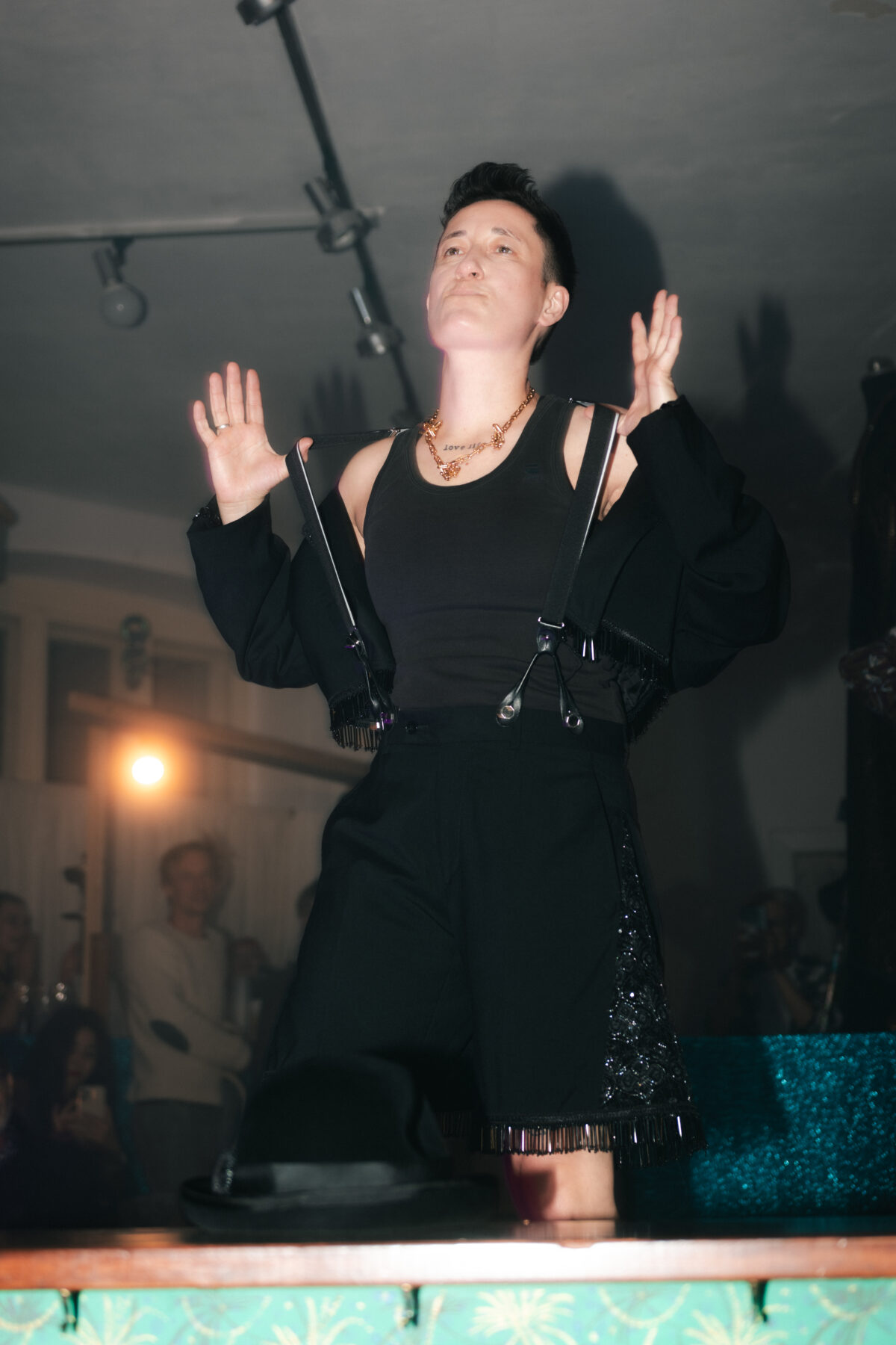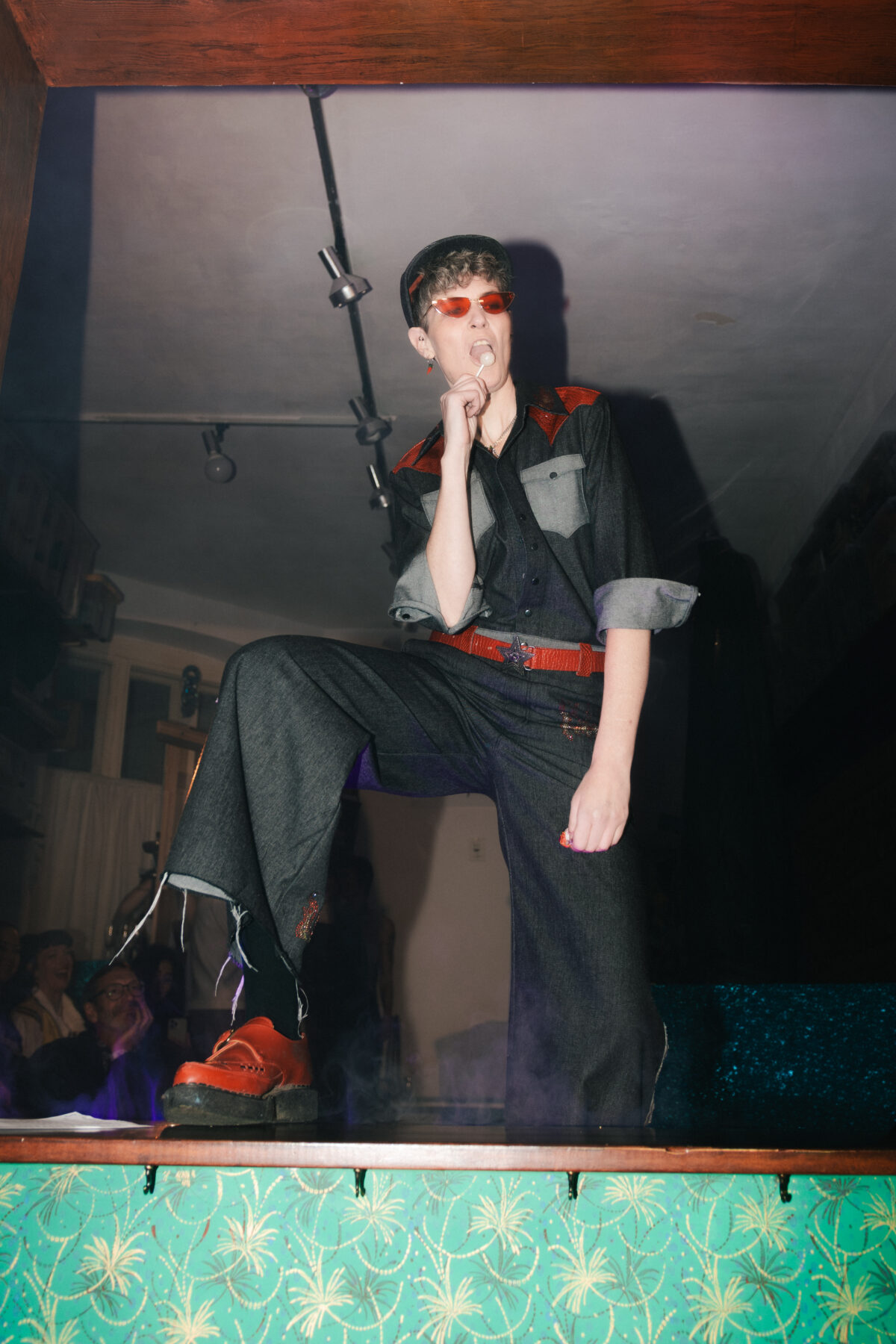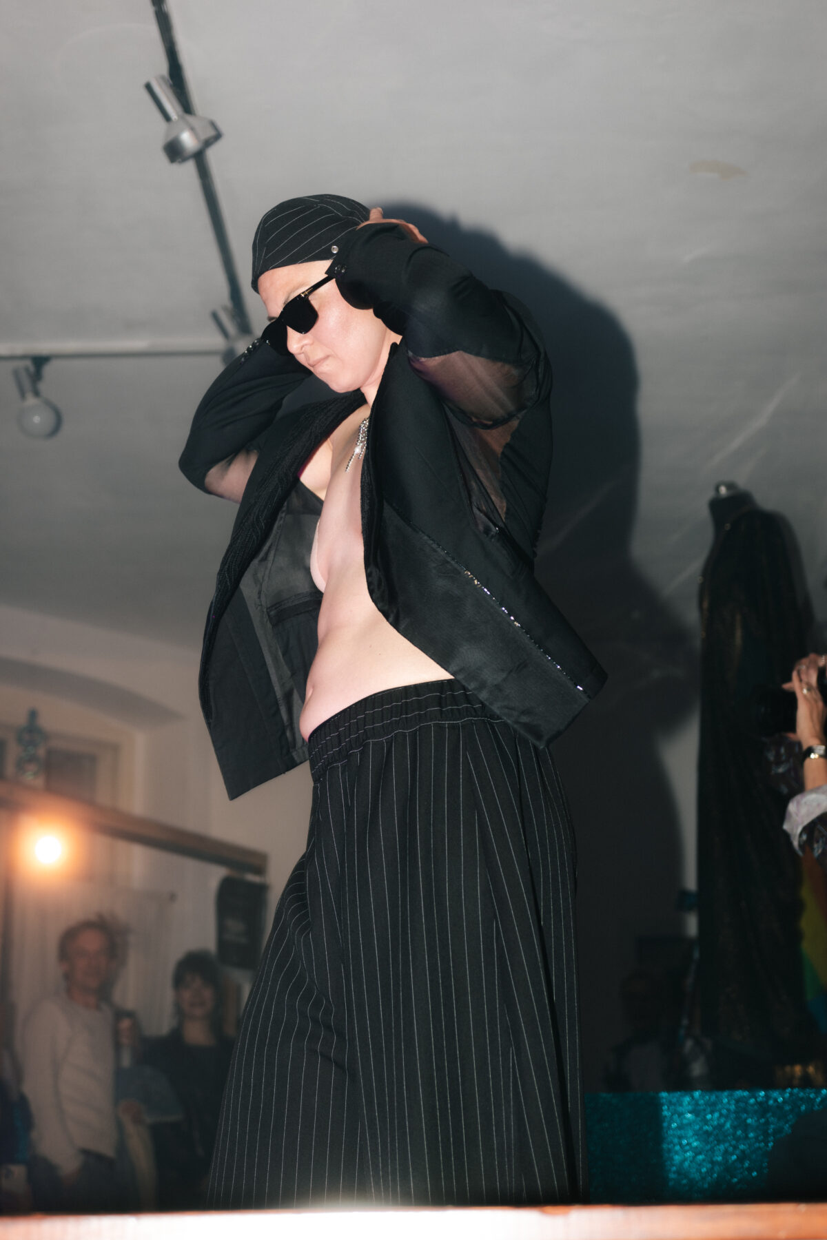Für den Butch*Walk 2025 entstand in Zusammenarbeit mit Calemi Jewelry eine Kollektion, die neu gefertigte Entwürfe mit upgecycelten Einzelstücken vereint. Die Kollektion umfasst eigens entwickelte Overalls mit einer Vielzahl präzise ausgearbeiteter Details sowie eine Reihe überarbeiteter Anzüge, die aus bestehenden Materialien neu konzipiert wurden. Ein exemplarisches Stück ist der Overall mit Ösendetails, der aus einem ehemaligen IKEA-Vorhang gefertigt wurde. Durch die gezielte Auswahl und Transformation vorhandener Materialien entsteht eine gestalterische Verbindung von Nachhaltigkeit, handwerklicher Sorgfalt und einer klar definierten ästhetischen Linie. Der Schmuck wurde eigens für diesen Anlass entworfen und gefertigt und ergänzt die Kollektion in ihrer formalen und materiellen Ausrichtung. Hüte und Schiebermützen unterstreichen darüber hinaus unser Verständnis eines ganzheitlich gedachten Outfits von Kopf bis Fuß.