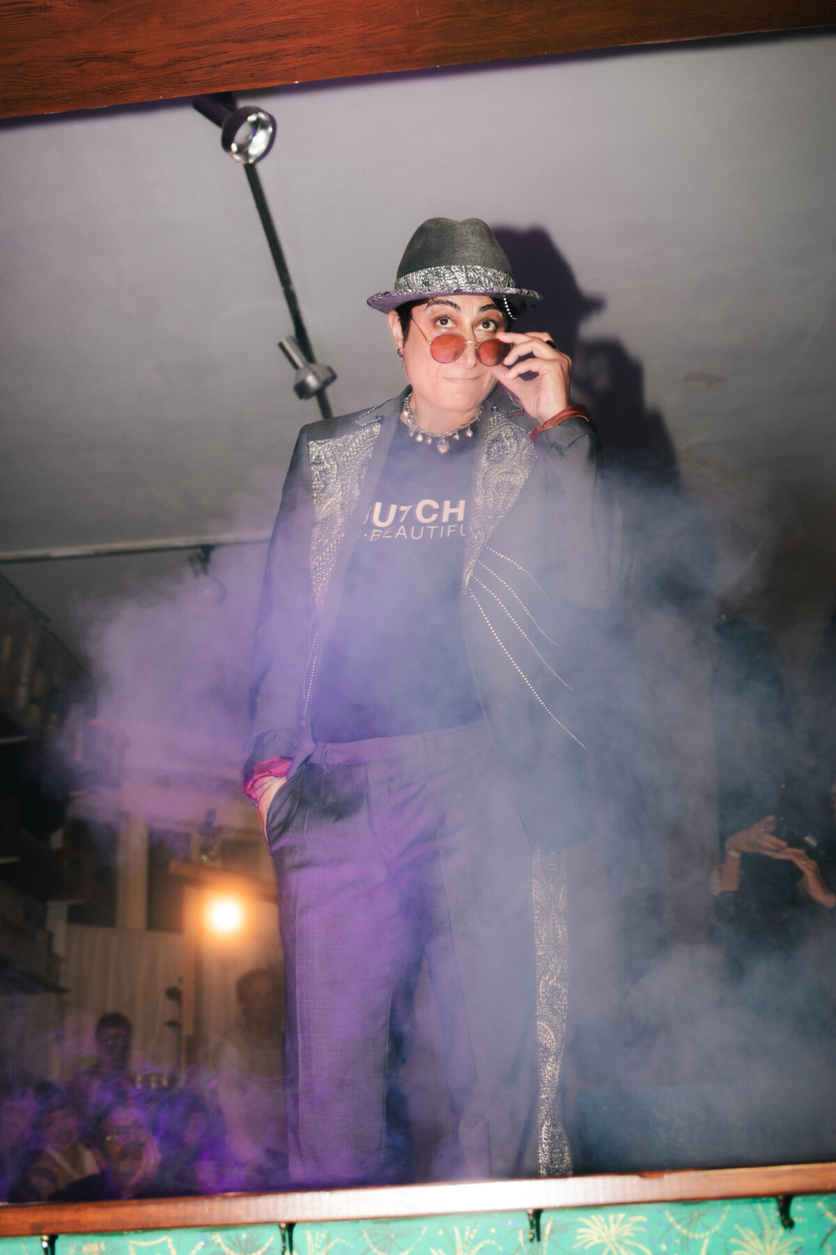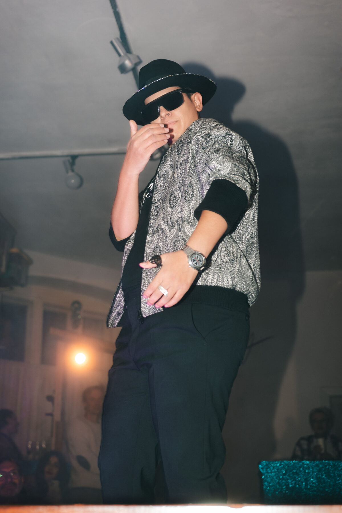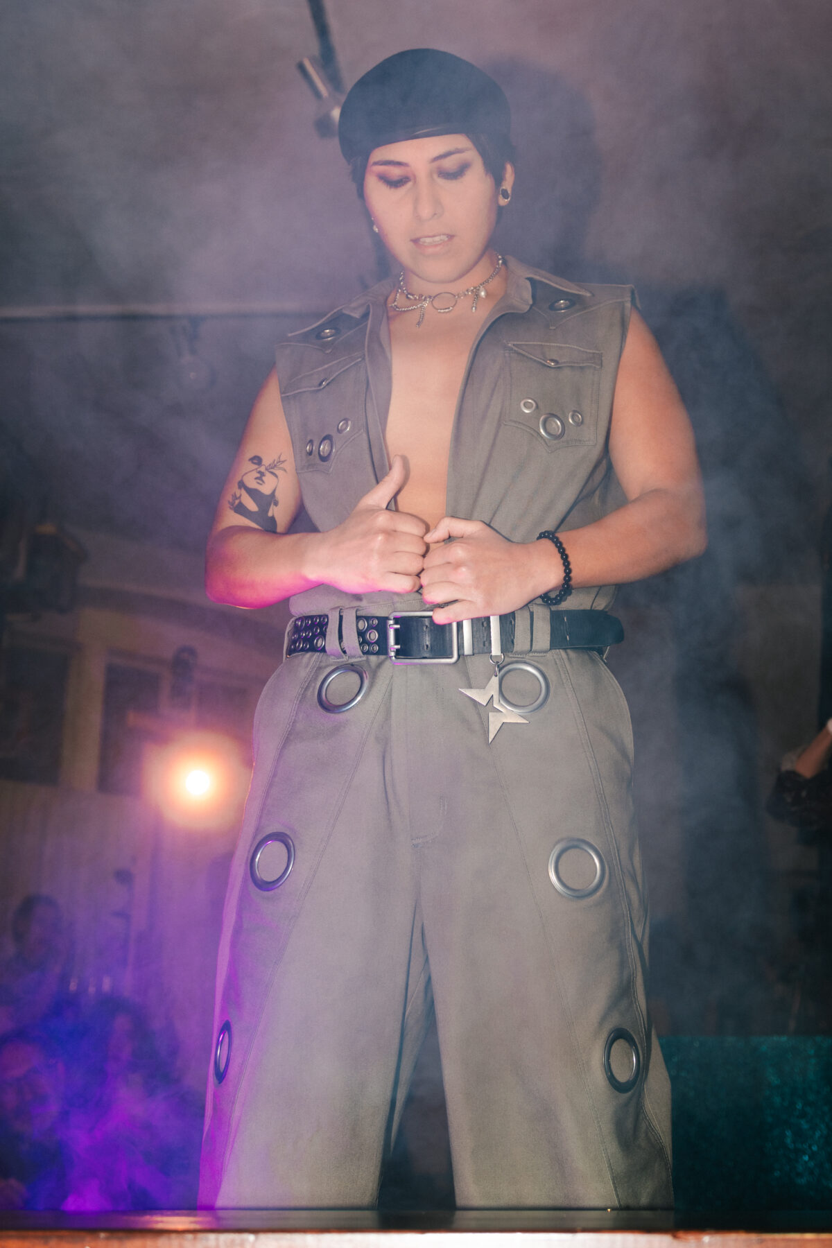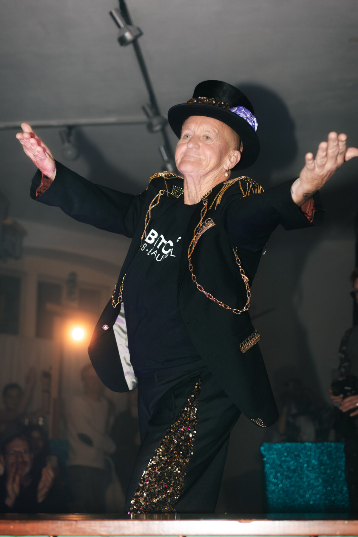 Für den Butch*Walk 2025 entstand in Zusammenarbeit mit Calemi Jewelry eine Kollektion, die neu gefertigte Entwürfe mit upgecycelten Einzelstücken vereint. Die Kollektion umfasst eigens entwickelte Overalls mit einer Vielzahl präzise ausgearbeiteter Details sowie eine Reihe überarbeiteter Anzüge, die aus bestehenden Materialien neu konzipiert wurden. Ein exemplarisches Stück ist der Overall mit Ösendetails, der aus einem ehemaligen IKEA-Vorhang gefertigt wurde. Durch die gezielte Auswahl und Transformation vorhandener Materialien entsteht eine gestalterische Verbindung von Nachhaltigkeit, handwerklicher Sorgfalt und einer klar definierten ästhetischen Linie. Der Schmuck wurde eigens für diesen Anlass entworfen und gefertigt und ergänzt die Kollektion in ihrer formalen und materiellen Ausrichtung. Hüte und Schiebermützen unterstreichen darüber hinaus unser Verständnis eines ganzheitlich gedachten Outfits von Kopf bis Fuß.