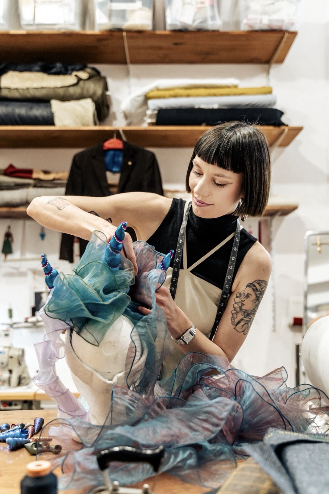 Jedes Kostüm wird nach den spezifischen Anforderungen gestaltet. Im Mittelpunkt unserer Arbeit stehen die Belastbarkeit, Änderungsfreundlichkeit, Größenvariabilität, Bewegungsfreiheit und optimale Wirkung auf der Bühne oder im Film. Durch die Verbindung von Maßschneiderei und Modistenhandwerk sind wir in der Lage, vollständige Kostüme mit komplexen Kopfteilen, Gestellen oder zum Beispiel Flügeln o.ä. umzusetzen – detailreich, stabil und individuell.